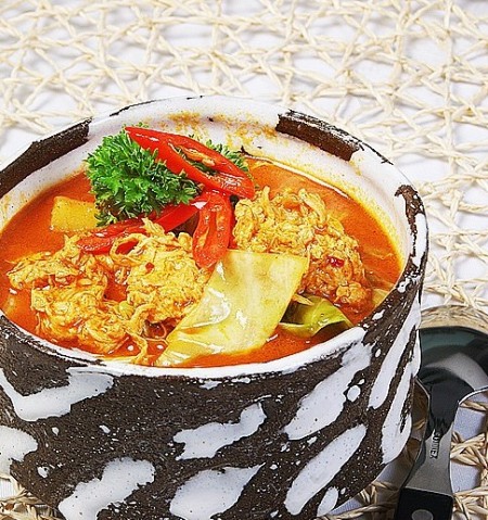 5. 锅内加入少许油,放入卷心菜煸香,放土豆、素鸡块、红咖喱加3杯水,大火烧开调小火略微煮一会儿。放盐、蘑菇精,不勾芡,出锅装在陶罐中,用红辣椒点缀。OK啦!