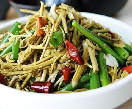 1、 煮泡后的木兰芽投洗干净,攥出多余水分,切段备用。