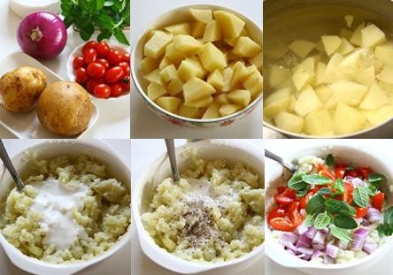 土豆,洋葱,小西红柿,薄荷叶,纯素色拉酱黑胡椒,盐